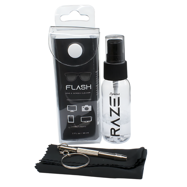 Keep your eyewear in prime condition and squeaky clean! Our patented sunglass lens cleaning kit and spray are the perfect match to any RAZE Eyewear. You get the following in each kit -